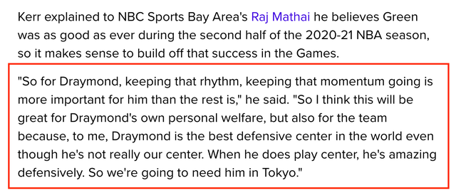 “对德雷蒙德来说,我认为这对他和球队来说都有好处。因为对我来说,德雷蒙德是世界上有最好防守的中锋球员,尽管他不完全是中锋球员,但当他顶上那个位置时,他就能有出色的表现,所以美国男篮需要他出战东京奥运会。”