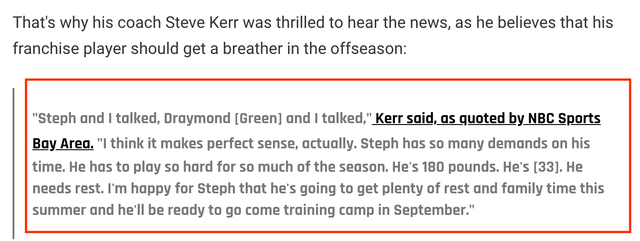 至于库里,科尔认为这名勇士传奇球星确实需要在今年休赛期好好休息: