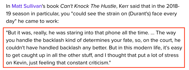 “是的,他就一直盯着手机。你处理压力的方式决定了你的命运,所以在球场上,他能很好地处理那些压力。只是在现代生活中,你很容易就陷入那些事情,我认为这给凯文-杜兰特带来很大的压力,他不断感受到批评。”