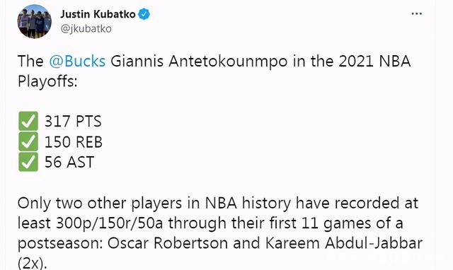 字母哥在其出战的前11场季后赛比赛中共计得到317分150篮板56助攻。据统计,在季后赛的前11场比赛中可以至少砍下300+150+50的球员除字母哥外仅有两人,他们分别是奥斯卡·罗伯特森和贾巴尔(2次)。