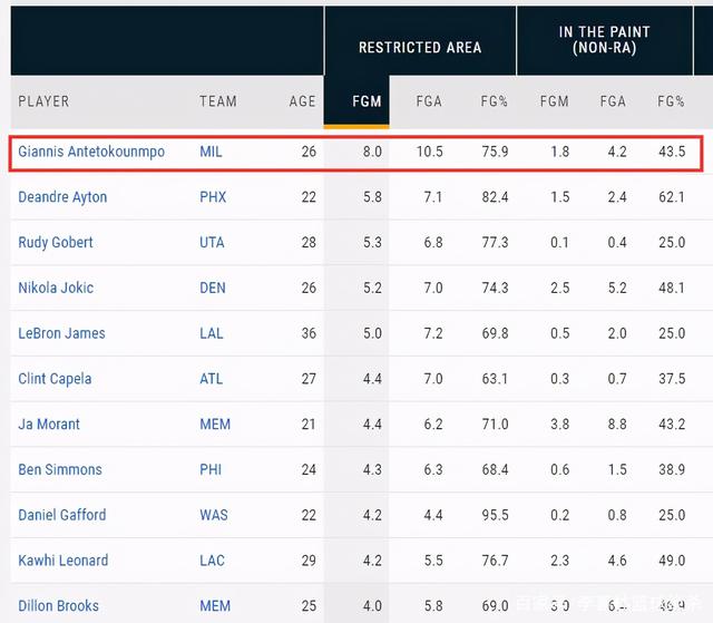 字母哥是季后赛里的禁区之王,限制区他场均投进8.0球排名第一,投篮命中率达到75.9%。太阳队艾顿在限制区场均投进5.8球第二,戈贝尔5.3球第三,约基奇5.2球第四,詹姆斯5.0球第五。