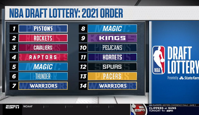 6月23日,NBA选秀大会乐透抽签举行,最终活塞拿下状元签,而常规赛倒数第一的火箭拿下榜眼,骑士探花签位,猛龙等队分居后面。值得一提的是森林狼获得第7顺位,在此前交易中已经给到了勇士,所以勇士获得了第7和第14两个签位。