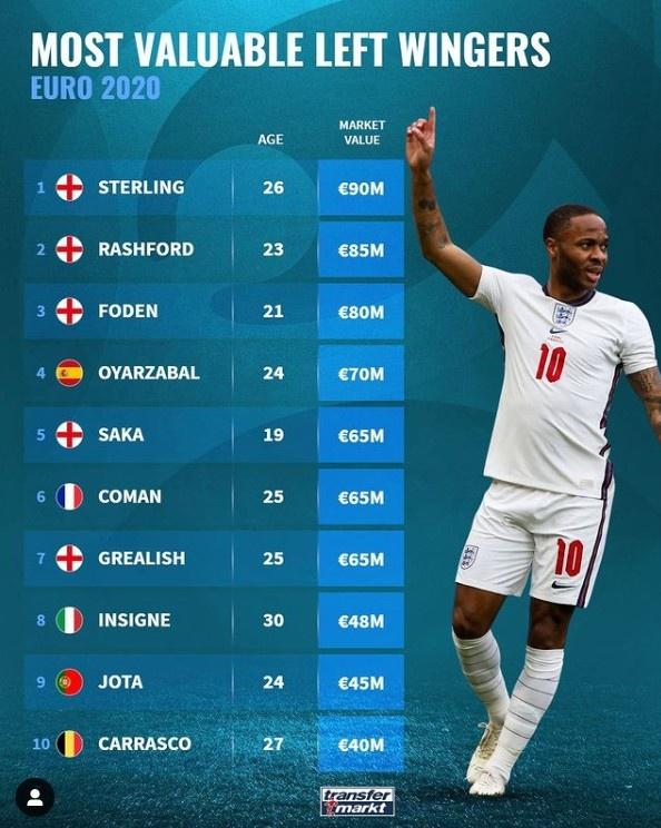 直播吧6月23日讯 德转统计了本届欧洲杯各队左边锋的身价榜单,英格兰堪称人才济济,在前7名中有多达5人入选,其中斯特林以9000万欧领跑。