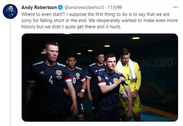 直播吧6月23日讯 欧洲杯D组第三轮,克罗地亚3-1战胜苏格兰,苏格兰积分垫底被淘汰。苏格兰后卫罗伯逊发推谈了自己的感受。
