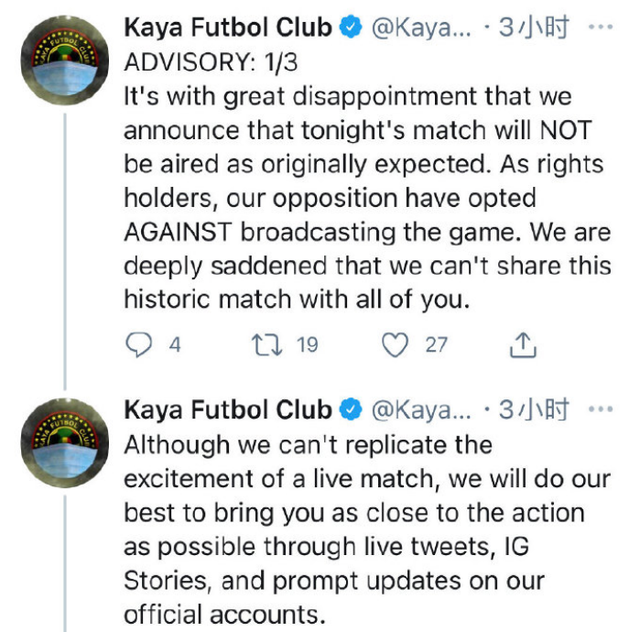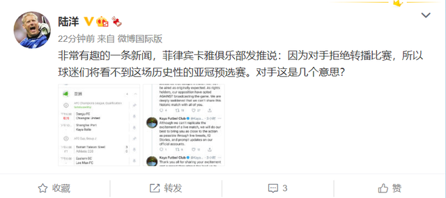 北京时间6月23日消息,亚冠附加赛将展开争夺,上海海港客场对阵菲律宾卡雅,胜者将进入亚冠正赛。本场比赛赛前,卡雅官方突然发声,表示海港拒绝转播,所以球迷无法观看本场比赛的直播,这又是什么操作呢?
