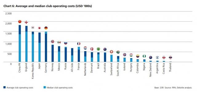 数据显示,中国女足联赛的运营支出排名世界第一,俱乐部平均支出接近200万美元(包括球员薪资、比赛日运营、营销、技术设施、管理成本等)。其次是英格兰、韩国、日本、德国,均超过100万美元。