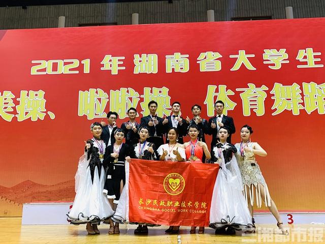 三湘都市报6月23日讯(通讯员 张丽丽 记者 杨斯涵 黄京)近日,由湖南省教育厅、湖南省体育局主办的2021年湖南省大学生体育舞蹈比赛在湖南师范大学隆重举行。长沙民政职院体育舞蹈队在比赛中获得高职专科组3枚金牌、4枚银牌,2枚铜牌,同时获得团体总分第一的优异成绩。据悉,本次比赛共有中南大学、湖南师范大学、吉首大学、长沙民政职业技术学院等40所学校50支队伍的700多名运动员参加。
