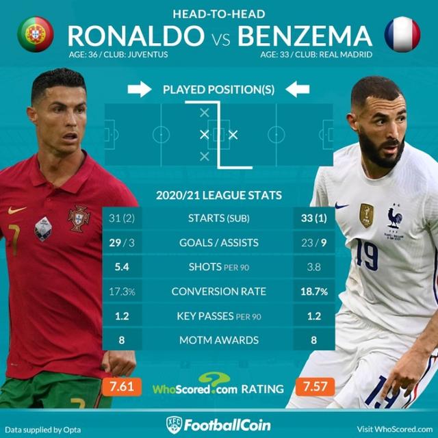 直播吧6月24日讯 C罗和本泽马将在今晚的欧洲杯小组赛重逢,whoscored也统计了两位球员本赛季在联赛的关键数据对比。