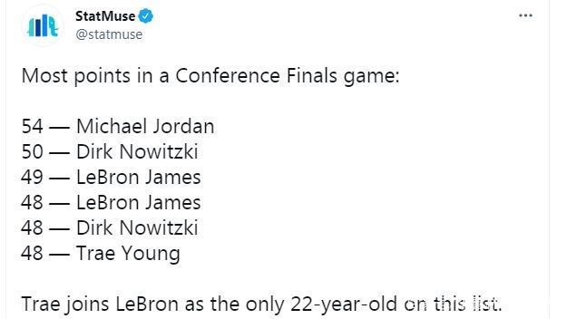第七,特雷·杨的48分追平詹姆斯,成为22岁以下在分区决赛得分最高的球员。