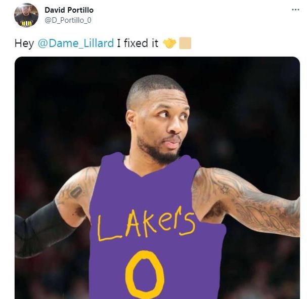 北京时间6月24日,当利拉德今年又是一轮游出局,不少网友希望利拉德能够更换球队。继网友P图利拉德穿爵士球衣后,又有网友P图利拉德穿湖人0号球衣,而0号现在属于库兹马,自然也意味着让库兹马“走人”。