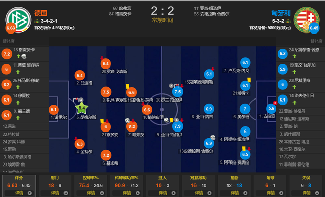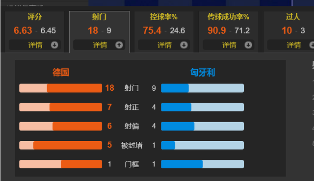 此役,德国控球率高达75.4%,一共有18次射门,是匈牙利的2倍,其中德国有7次射正,比匈牙利多3次,但匈牙利的反击效率极高,两次取得领先,德国最后时刻绝杀,以小组第二晋级,1/8决赛将要去温布利大球场挑战英格兰。
