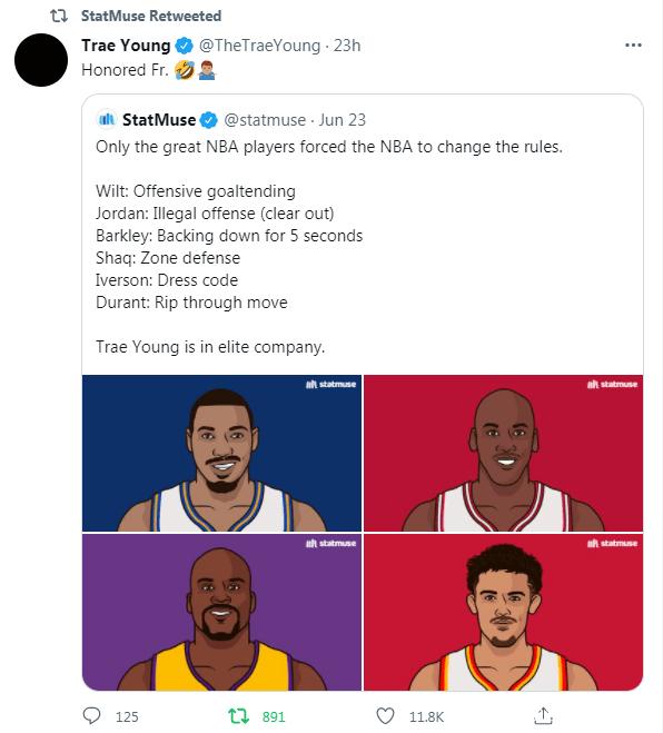 这一规则引起了不少讨论,有趣的是,特雷杨自己也加入了讨论——网友调侃特雷杨,表示杨加入张伯伦、奥尼尔、乔丹等人的行列,让联盟改了规则,然后特雷杨还转发了这条状态,并且表示受宠若惊…