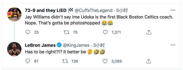 杰伊-威廉姆斯在这条推特上表示,伊姆-乌多卡是凯尔特人队史第一位黑人主教练,但实际上,凯尔特人队史还是有不少黑人曾担任球队主教练,对此勒布朗-詹姆斯也在社交媒体上有所反应: