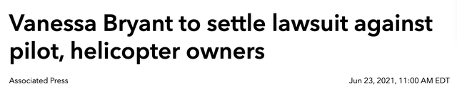 最后需要谈及的是,关于科比-布莱恩特直升机事故的一起诉讼如今也已经有结果。据报道,科比-布莱恩特遗孀已经同意与直升机租赁公司和解,不过和解细节并没有被曝光: