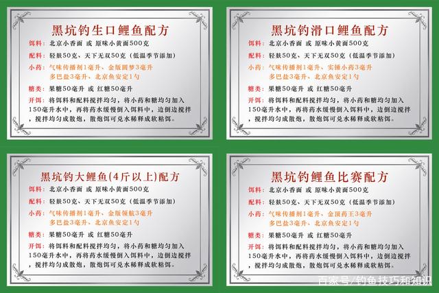四、在黑坑钓鲤鱼的糗鱼技巧。当钓点里的鱼口变慢,或者停口以后,可以采取如下方法。每个黑坑鲤鱼正钓时,中间都会打开增氧机一段时间,在开增氧机的前十分钟,可以适当的加大打窝量,然后放下鱼竿,停止垂钓,休息十多分钟,等鱼进窝。等增氧机打开以后,抛竿试口,如果有口,可以开钓,没口的话, 继续等待。下图是在黑坑钓鲤鱼的饵料配方,供各位钓友参考。