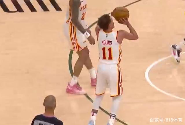 比赛第三节,特雷-杨进攻面对霍勒迪防守,一个拉球变向就将对手晃飞了,面对无人防守的篮筐,他抖动了一下肩膀,停顿了3秒之后才出手三分,结果稳稳命中。