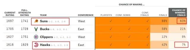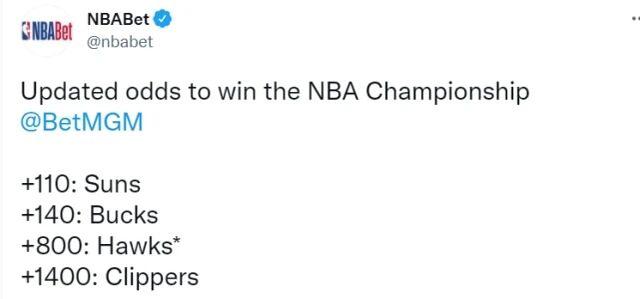 随着老鹰1-0雄鹿,快船和太阳在双方各少一名核心的情况下,太阳凭借布克第一场40分大爆发,第二场佩恩29分神兵天降,以及关键时刻的艾顿空接暴扣绝杀,太阳2-0领先快船,而NBA官方也是根据了这最新情况、球队实力的变化,更新了最新一起的球队夺冠赔率榜单,具体如下: