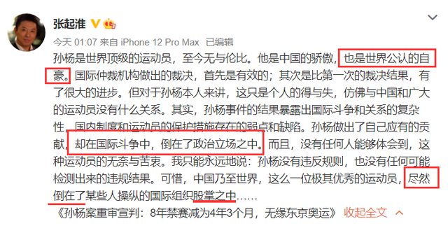 在经过几个月的等待之后,CAS发布了孙杨的最终处罚结果。最终4年3个月的禁赛处罚,相比此前的8年顶格处罚,已经减轻了很多。不过这样的处罚,对于孙杨的职业生涯,依然是毁灭性的打击。而在结果出炉之后,帮助孙杨在第一次听证会辩护的律师张起淮,也发布动态为孙杨感到忿忿不平。不过张起淮的这番言论,却遭到了网友的嘲讽。