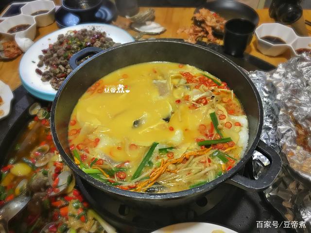 最后一道是这一家店的招聘菜,石锅鱼。把加热到极致的石头蛋置于石锅底下,然后倒入片好的鱼肉再倒入搭配煮好的高汤。只见一阵水蒸气,鱼汤鱼肉就沸腾起来了。味道香、口感好,就是特制的鱼汤调味料不少。