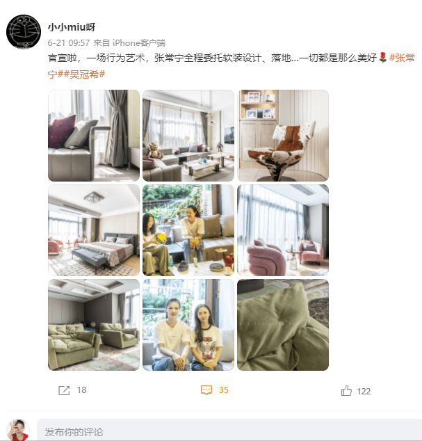 这是一个来自某设计公司美女“小小miu呀”发的微博,她说:“官宣啦,一场行为艺术,张常宁全程委托软装设计、落地…一切都是那么美好!”后面加上了#张常宁##吴冠希#的热门话题。通过这条简单的微博可见,尽管张常宁和吴冠希没有发微博造势,但两人装修的婚房是对外公开了,并且可以看出装修设计单位还是非常满意,用了“行为艺术”和“一切都是那么美好”,也从另一个角度表达张常宁本人非常满意(否则就不美好了)。
