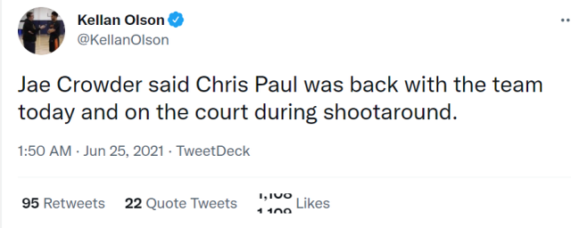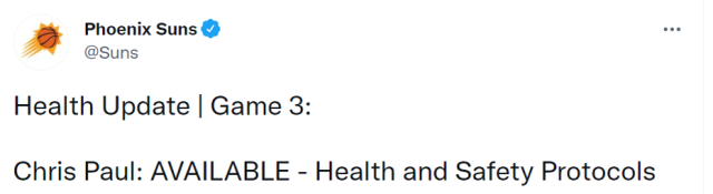 北京时间6月25日,太阳队官方宣布,克里斯-保罗的G3状态变更为AVAILABLE,也就是可以上场。缺席了西决前两场比赛的CP3,终于迎来复出。克劳德表示,保罗今天回到球队中,并参加了投篮训练,他已经做好准备上场比赛。官方也晒出了保罗的训练照,他一脸微笑,心情不错。