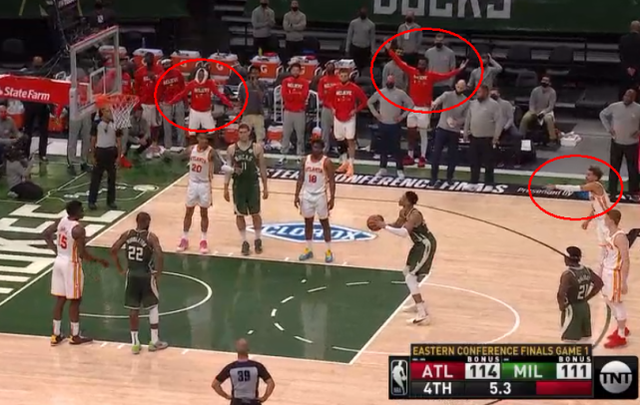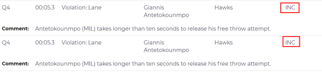 距离比赛结束还有5.3秒时,雄鹿落后3分,字母哥获得两次罚球机会。今年季后赛罚球一直不稳定的字母哥,在关键时刻两罚两中,但裁判报告显示,字母哥的两次罚球都出现了10秒违例,当值裁判没有吹罚。当时,老鹰的替补席和场上的球员都在示意裁判,字母哥罚球10秒违例了。不过,裁判没有理会。