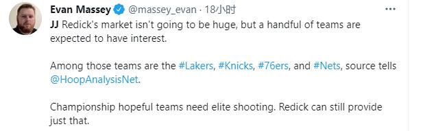据NBA记者Evan Massey报道,自由球员JJ-雷迪克的市场价格不会很高,但许多球队预计仍将对他有意,这些球队包括湖人、尼克斯、76人和篮网,雷迪克本赛季在独行侠受到了伤病困扰,他本赛季的三分命中率只有37.1%,当年在鹈鹕队的时候,他的可以投出45%的三分命中率,已经37岁的雷迪克确实不行了,三分不行,防守绝对漏勺,到了季后赛,雷迪克估计连上场都没戏。