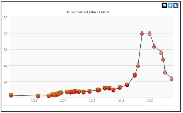 2018赛季,武磊如愿以偿地拿到了中超金靴,摆脱掉了“土炮”的称号。这也成为了他转会西甲,加盟西班牙人的有利条件。加盟西班牙人之后,武磊的身价随着自己惊艳的表现不断攀升,在2019年6月一度达到了1000万欧元,这也创造了中国球员最高身价的纪录。然而,从武磊加盟西班牙人的第二个赛季开始,俱乐部频繁更换教练。武磊不再是球队的主力球员,他的身价开始断崖式的下跌。