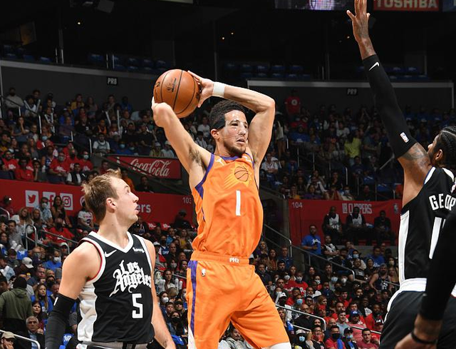 在上一场比赛当中,布克面对贝弗利撕咬式的防守,个人进攻效率就已经出现了明显的下滑,再加上鼻子受伤,本场比赛曼巴传人戴着面具出战,这也在一定程度上影响了他的发挥,全场比赛21次出手只命中了5球,其中三分球更是只有7投1中的表现,只有15分进账,还出现了全队最高的4次失误。