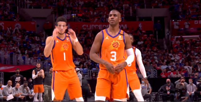 保罗和乔治也是激烈讨论,乔治的三分命中,快船打出19比3的攻势,领先13分。布克再次出场,但还是不进,曼恩两分打进,21比3。布克终于打进两分,克雷格造犯规两罚全中,约翰逊的三分命中,太阳连追7分,莫里斯的三分命中,布克造犯规两罚全中又打进,肯纳德的三分命中,约翰逊造犯规两罚全中,乔治的压哨三分命中,单节比赛快船34比21赢了13分,反超11分。