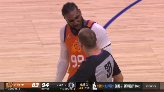 比赛末节,太阳一度将分差追到6分,但此时裁判又发威了。克劳德在防守乔治的时候,先是被后者推了一把,紧接着贴防过程中右手蹭到了乔治的下巴,被裁判吹罚了第6次犯规。这个回合显然让克劳德非常不满,他愤怒地找裁判理论。显然克劳德不满的不是自己被吹犯规,而是前面乔治的推人没有吹。事实上,这个回合就是全场比赛的缩影。快船这边各种大动作,裁判理都不理,而太阳这边只要伸手一摸,那必被吹犯规!裁判这样的“双标”判罚,恰恰就是联盟想要的效果!