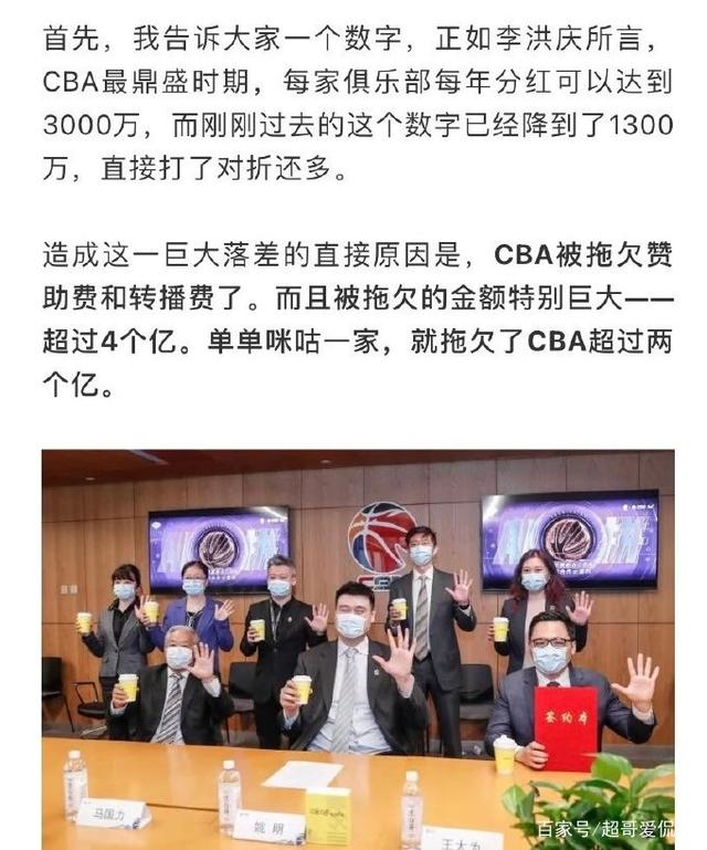 2.《[超哥爱侃球]赞助费被欠4亿!外援支出6亿!CBA发展沉重打击,姚明无计可施》仅供读者参考,本网站未对该内容进行证实,对其原创性、真实性、完整性、及时性不作任何保证。