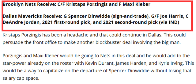 Greg Patuto给出的5换2交易方案为:篮网送出丁威迪、乔哈里斯、小乔丹以及2021年首轮签、2021年次轮签;独行侠送出波尔津基斯、马克西-克勒贝尔。其中丁威迪为先签后换,这笔交易若达成对于双方来说,都非常大有益处。