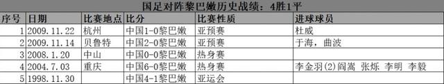 国足跟黎巴嫩首次交手,是1998年亚运会,国足4-1大胜对手。2004年热身赛,国足6-0狂胜。2008年热身赛,国足0-0被逼平。2009年亚预赛,国足两回合2-0和1-0实现双杀。