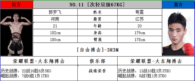 郭梦飞是荣耀军团中第五代拳手的代表,身高182cm,臂展180cm,肌肉解析度非常好,在大东翔经过5年艰苦的训练,郭梦飞已经成长为一名拳法犀利,腿法猛锐的节奏进攻型拳手,无论是腿法还是膝法,都有他独到的理解。