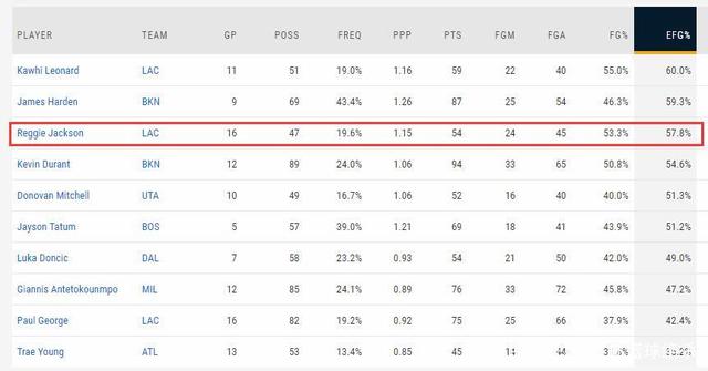 北京时间6月26日,美媒StatMuse列出了一组数据,季后赛单打有效命中率(至少出手40次)榜上,莱昂纳德第一,哈登第二,雷吉·杰克逊第三。杰克逊成为了快船本赛季的一大惊喜,他在季后赛坐稳首发控卫位置,展现出来的价值远超233万美元年薪。