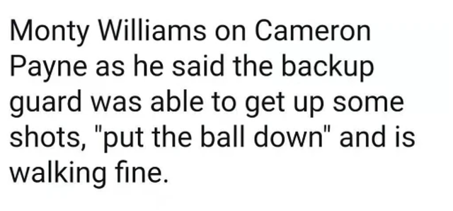 西决方面,太阳输掉了第3场,不过他们依然2比1领先,第4场比赛,太阳还有机会拿到赛点。第3场比赛,佩恩受伤离场,最新的消息显示,太阳主帅蒙蒂威廉姆斯透露,佩恩的伤情好转,有望出战G4的比赛,这对太阳是个很好的消息,毕竟佩恩的突破和传球,对太阳的替补席还是一个很大的提升,他是保罗的好帮手,前两场赢球,佩恩也发挥非常出色。