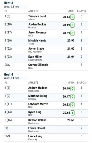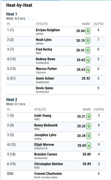 本次预赛第一小组,莱顿20秒04(-0.2m/s)小组第一,也是总排名第一位,这一成绩也刷新了莱尔斯2016年创造的美国高中生200米纪录20秒09。莱尔斯20秒19小组第二,也是总排名第二位,在百米比赛中以9秒86拿到了奥运会门票的名将科利尔20秒41排名第三位。