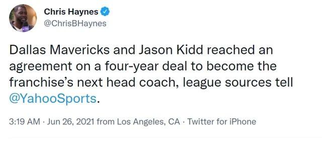 但是,没想到的是基德拒绝了开拓者,却选择了独行侠!北京时间6月26日,据名记克里斯-海耶斯报道,独行侠和基德已经达成了一项为期4年的合同,基德将成为独行侠的新任主教练,也是独行侠队史上的第10位主教练。另一位名记查拉尼亚报道称,独行侠也确定将聘用尼克-哈里森担任篮球运营总裁兼总经理。前独行侠后卫巴里亚有望加入基德的教练组。