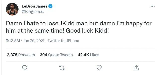 此消息一出詹姆斯就立马前来送别,詹姆斯在自己的社交媒体账号上发推说到:“我厌恶失去基德,但与此同时,我为他感到高兴!祝你好运,基德!”因此,基德才成为了湖人的离队第一人,告别了老詹,告别了戴维斯,也告别了湖人。