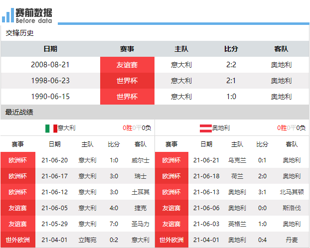 双方近3次交手,意大利2胜1平,但过去都很久了,没有太大的参考价值。意大利各项赛事近6场比赛,6战全胜,球队处于最佳状态;奥地利各项赛事近6场比赛,2胜1平3负,面对荷兰、英格兰和丹麦都输了球,奥地利面对强队战绩相当糟糕。