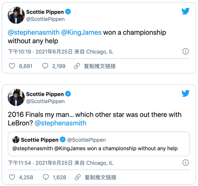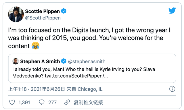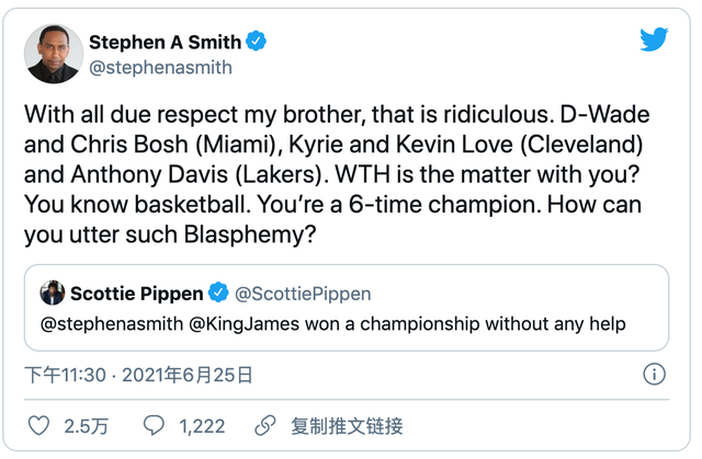 美国杨毅斯蒂芬-A-史密斯也回应了皮蓬的推文,并且表示当年骑士是拥有詹姆斯,欧文和乐福的球队:
