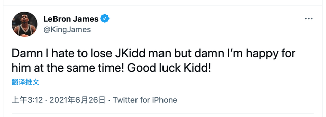 在关于基德成为独行侠主教练的消息被曝出后,作为湖人当家巨星的勒布朗-詹姆斯也表达了对基德过去两年时间工作的认可以及在他成为独行侠主教练之后的祝福: