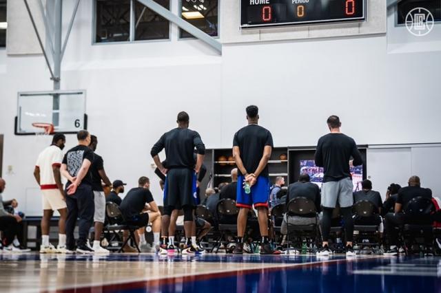 今日训练结束后,快船全队进行了比赛录像分析,莱昂纳德也身着便装现身。