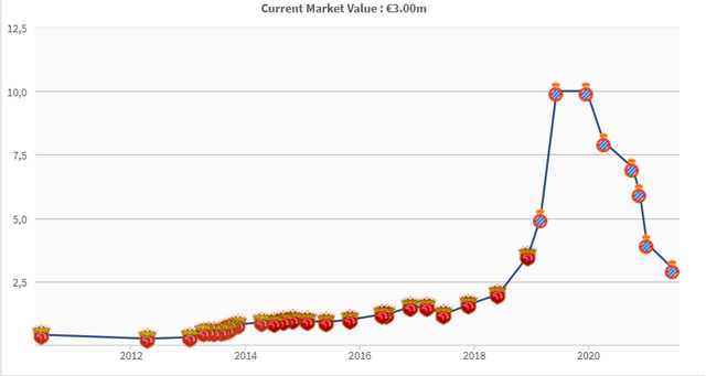2018赛季,武磊带领上海上港(上海海港前身)打破了广州恒大对于中超冠军的垄断,本人还获得联赛金靴,他的身价也涨到了350万欧元,之后便一直呈现上涨的趋势。