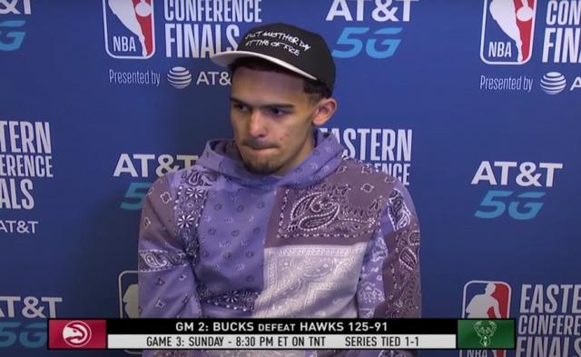 直播吧6月26日讯 东部决赛G2,老鹰惨败雄鹿。本场比赛特雷-杨出场28分钟,16中6得到15分2篮板3助攻9助攻。赛后,杨接受了采访。