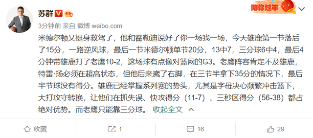 对于这场比赛,苏群直言有点像是打篮网的第3场,确实,米德尔顿超级的发挥,字母哥冲击篮下,还是内线得分和快攻都占优,这也是雄鹿对比老鹰的优势。特别是内线得分,雄鹿再次优势明显,而老鹰第一节三分不错,取得领先,但当三分不好的时候,也就没办法了,他们还是只能靠进攻去赢球。