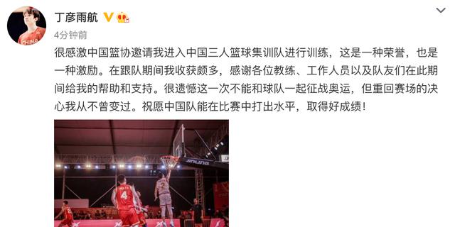 北京时间6月28日,中国三人国家队官方宣布丁彦雨航、郭瀚宇两名球员正式告别,无缘入选最终的大名单,国家队认可这两名球员的付出,尤其是针对小丁评价道:“丁彦雨航通过积极努力,克服了许多困难,但无奈奥运赛事将至,丁彦雨航的状态与参赛要求之间还有一定距离,只能遗憾离队。”