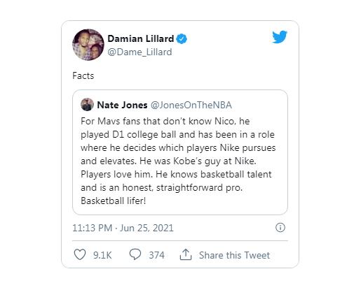 当所有人都对库班任命尼科-哈里森出任总经理表示不理解的时候,利拉德第一时间对库班的这个决定点赞并转发。尼科-哈里森在波特兰工作的时候与利拉德建立起了很棒的私人感情,双方熟知关系密切。
