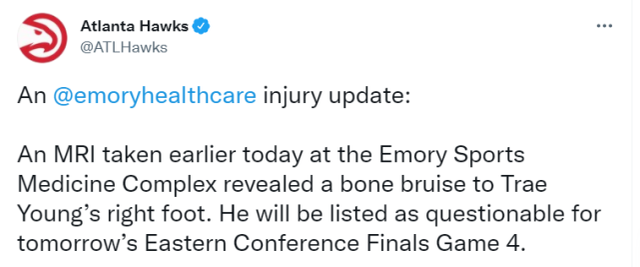 北京时间6月29日,老鹰官方更新了特雷-杨的伤情。他在当地时间今天早些时候接受核磁共振检查,检查结果显示右脚出现一处骨挫伤。6月30日开打的东决G4,杨的状态是questionable(出战成疑,上场可能50%)。